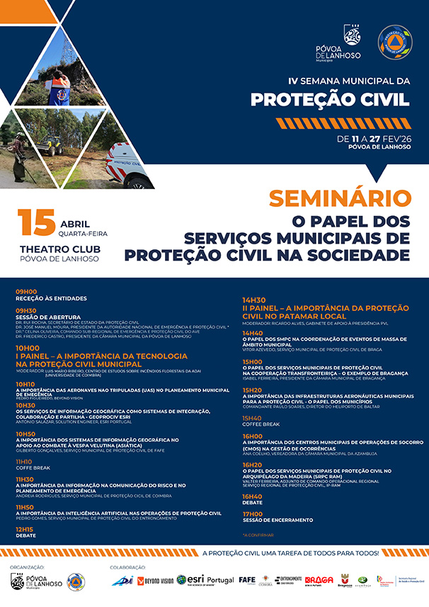 O Município da Póvoa de Lanhoso irá realizar no dia 15 de abril de 2026, nas instalações do Theatro Club da Póvoa de Lanhoso, um Seminário sobre “O papel dos Serviços Municipais de Proteção Civil na Sociedade”.